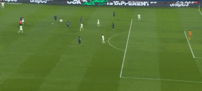 巴黎在中路连续传球,埃杜分球,登贝莱带球杀到禁区里。此时,对方禁区里只有登贝莱一个巴黎球员。面对里尔的4名后卫,登贝莱一点不慌,横向拉球,连续2个横向拉球,戏耍了他们的整条防线。